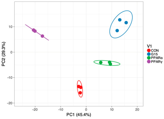 Principal component analysis and hierarchical clustering of samples based on genes with altered expressions. Global ANOVA test across PPARα, PPARγ and GPER antagonist-treated groups. (CON—control group, PPARα—group treated with PPARα antagonist, PPARγ—group treated with PPARγ antagonist, G15group treated with G15 antagonist).