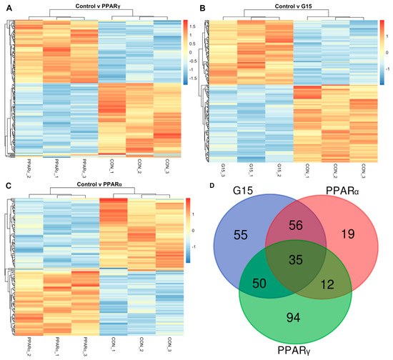 Expression profiles based on genes differentially expressed between control group (CON) and and (A) group treated with PPARγ antagonist (PPARγ), (B) G15group treated with G15 antagonist (G15) and (C) group treated with PPARα antagonist (PPARα). See Results (paragraph 3.5) for differentially expressed genes. (D)Venn diagram demonstrating the number of differentially expressed genes in experimental groups (PPARα—group treated with PPARα antagonist, PPARγ—group treated with PPARγ antagonist, G15—group treated with G15 antagonist).