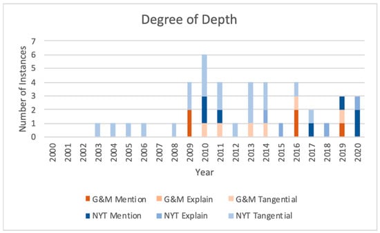 We divided the coverage into three categories to assess depth of coverage: tangential, mentioned, and explained. Twenty-six of the 42 pieces (62%) were coded as tangential; that is, eDNA was not the focus of the piece and was only mentioned tangentially in discussing the main focus of the article. For instance, in an article on Asian carp as an invasive species, the authors write “Despite electronic barriers and other efforts to contain the carp, a recent University of Notre Dame study found traces of carp DNA in Calumet Harbor, near Navy Pier and at the Wilmette pumping station” [33]. The proportion of tangential references per total newspaper coverage was approximately 55% in the G&M and 65% in the NYT. As illustrated in Figure 1, no articles meeting the inclusion criteria for analysis were published in the years 2000–2002 and 2007, those that were published prior to 2009 were merely tangential, and the proportion of tangential references has decreased over time relative to the more mentions and explains categories.