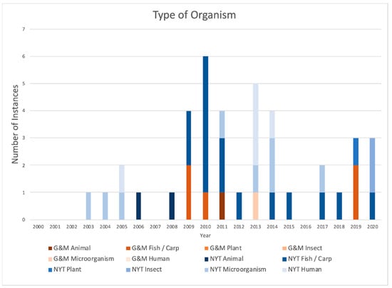 Type of organism referenced in conjunction with eDNA in the G&M and NYT, 2000–2020.