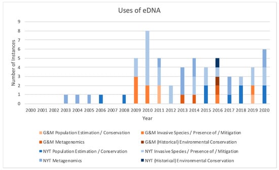 Uses of eDNA reported in the G&M and NYT, 2000–2020.