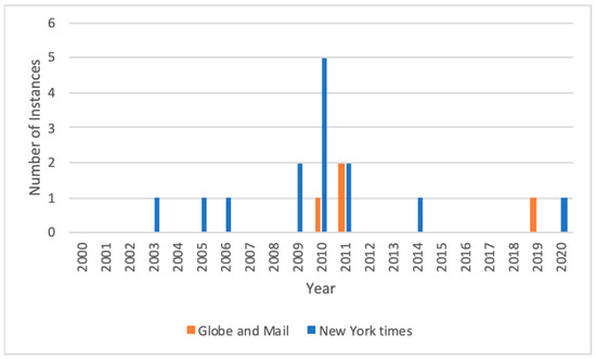 We analyzed news coverage of environmental DNA in Canada and the United States published in the Globe and Mail and the New York Times, which are considered ‘newspapers of record’ in each respective country, although the G&M is based in Toronto and the NYT in New York. All stories, op-ed columns, and editorials published between January 2000 and July 2020 were analyzed. While eDNA emerged as a tool as early in the 1980s, we selected the date range from 2000 to 2020 because eDNA was not used extensively in genomics until the early 2000s. We compiled the data by searching the two newspapers using the Factiva database with the keywords “environmental DNA” and “metagenom*”. Using this method, we identified 92 articles that included these keywords.