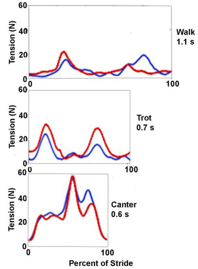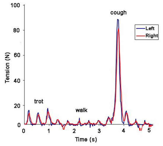 In walk there are two rein tension spikes per stride cycle. These relate to the obvious nodding motion of the head and neck, when the croup oscillates, which is a component of the inverted pendulum dynamics of the gait that is a mechanism for reducing energy expenditure [7]. Riders try to maintain a relatively constant rein tension by allowing their hands to follow the motion of the horse’s head. This, in combination with the walk having no suspension phases, results in the rein tension spikes being small in magnitude (Figure 1). The two spikes within each stride are, however, often different in magnitude. A study using side reins reported a single large spike in the rein ipsilateral to the forelimb as it leaves the ground coordinated with a smaller spike in the contralateral rein [8]. The graph shown in Figure 1 has a higher spike in the rein ipsilateral to the forelimb leaving the ground and a smaller spike in the contralateral rein. This may relate to the fact that walking horses display some lateral movement of the head between left and right forelimb stance phases [8] and that when side reins are used, there is no compensation for asynchronous changes in tension as there might be with a rider.