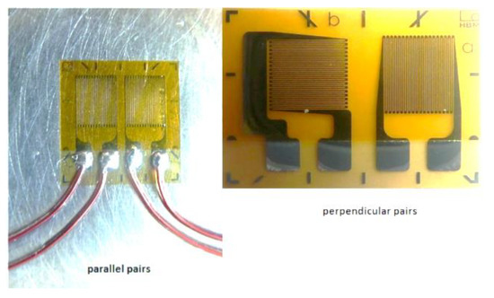 Examples of strain gauges. Left: the metallic foil pattern, is arranged in parallel; right: the metallic foil patterns of the two strain gauges are arranged perpendicular to each other (image from [14].