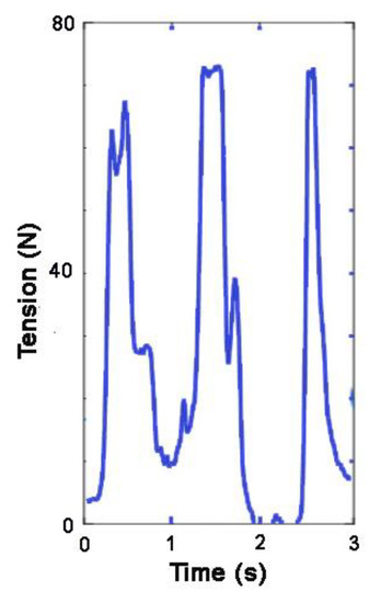 Rein tension measures a pulling force applied to the rein by the horse and/or rider. Tension values alone cannot distinguish between these two sources. Each gait has a characteristic rein tension pattern produced by mechanical oscillations of the horse’s head and neck repeated on a stride-by-stride basis [6]. This gives rise to a repetitive pattern of spikes that occur at fairly regular intervals with intervening decreases to a minimum or baseline value. Superimposed on this basic pattern are the effects of the rider’s aids, which can differ in magnitude, duration, and timing within the stride and so add a level of unpredictability. Furthermore, the impossibility for the rider to be perfectly coordinated with the horse’s motion, together with extraneous movements of the horse’s head, contribute to variability in the signal.