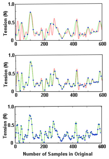 Rein tension curve from a horse trotting with loose reins originally sampled at 240 Hz (red lines). The blue dots represent the data points for each sampling rate (12, 24, 48 Hz) and the green lines are the reconstructed curves after down-sampling to 12 Hz (upper graph), 24 Hz (middle graph), and 48 Hz (lower graph) and then up-sampling to the original sampling rate. The signal is not well preserved after down-sampling to 12 Hz. At 24 Hz some small peaks and troughs are missed and the values of large peaks tend to be under-estimated. At 48 Hz most features of the original 240 Hz curve are preserved.