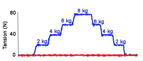 Calibration of a transducer by hanging weights of 2, 4, 6, 8, 6, 4, and 2 kg from the transducer and recording the output voltage which is converted to Newtons. In this example weights were added to the right rein at intervals of 10 s and removed at intervals of 6–8 s, Red: right rein; blue: left rein.