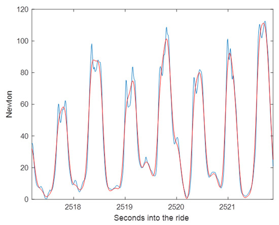 Rein tension data from the left rein in canter, sampled at 128 Hz. Original trace in blue and low-pass filtered trace in red (filter of order 2 and cutoff frequency 5 Hz). Note the loss and attenuation of the peaks.