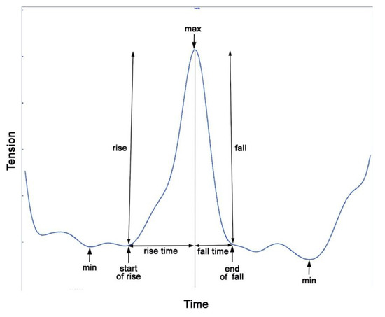 To quantify how quickly the rein tension changes, the rate of rise and fall can be calculated. The rise is the change in tension between the start of the rise, which often does not coincide with the minimal value, and the maximal tension. Rise time is the time over which the rise occurs. Rise rate is calculated by dividing the magnitude of the rise by the rise time (Figure 8).
