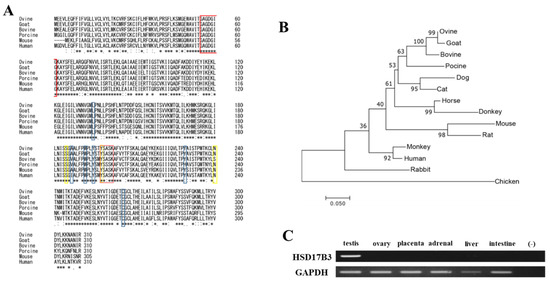 Alignment (A), phylogenic analyses (B), and tissue expression for ovine HSD17B3. (A) Alignment of the deduced HSD17B3 amino acid sequences of ovine, goat, bovine, porcine, mouse, and human. The asterix (*) are the conserved amino acids among all species. Conserved cofactor-binding motif (GXXXGXG) and active site (YXXXK) are shown by redline boxes. Putative amino acids for strong and weak androgen-binding are shown by the yellow line and blue line box, respectively. (B) The phylogenetic tree of HSD17B3 deduced amino acids. Bootstrap values (100 resamplings) are indicated by numbers. (C) Tissue expression of HSD17B3 genes. RT-PCR analyses of each gene in ovine testis, ovary, placenta, adrenal, liver, and intestine.