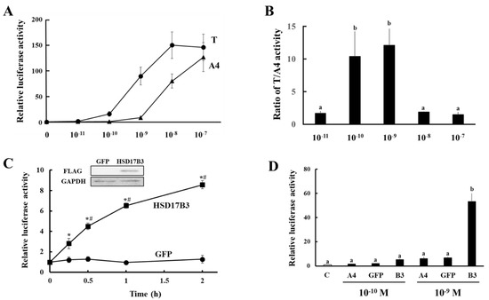 Androgens are sex steroid hormones that play various roles both in male and female physiological processes via pathways involving the androgen receptor (AR). Testosterone (T) is the most important androgen, and is produced from cholesterol in the gonads and adrenals in a series of steps by cytochrome P450 hydroxylases and hydroxysteroid dehydrogenases (HSDs) [1,2]. First, 17-HSDs catalyze the final step, the conversion of androstenedione (A4) into T. Further, 17-HSDs have been identified as the enzymes that interconvert 17-keto and 17-hydroxy sex steroids, which include at least 14 family members [3]. Moreover, 17-HSDs catalyze the reactions of not only steroid hormone metabolism, but also other metabolic pathways. Among the family members, HSD17B1 and HSD17B3 are involved in gonadal T production in mammals.