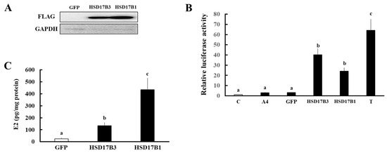 Extraction of total proteins from cultured cells and subsequent quantification were conducted as described previously [29]. Equal amounts of protein (50 or 100 μg) were resolved using 10% SDS-PAGE and transferred to polyvinylidene difluoride membranes. Western blot analyses of FLAG, HSD17B3, and GAPDH were performed with antibodies directed against FLAG (1:1000; M2, Sigma-Aldrich Co. LLC, Saint Louis, MO, USA), HSD17B3 (1:1000; PAF173Hu01, Cloud-Clone Corp., Katy, TX, USA), and GAPDH (1:1000; 14C10; Cell Signaling Technology, Inc., Danvers, MA, USA), respectively. Immunoreactive proteins were detected using horseradish peroxidase-labeled secondary antibodies (1:10,000; Jackson ImmunoResearch Labs, West Grove, PA, USA) with Clarity Western ECL substrate (Bio-Rad Laboratories Inc., Hercules, CA, USA). Signal intensity was calculated using Image J software (Figure S1, [30]).