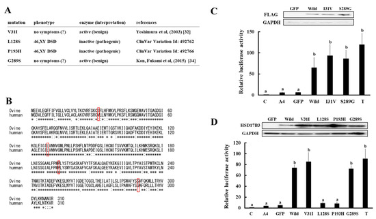Enzymatic activities of missense mutations in ovine and human HSD17B3 genes. (A) Clinical symptoms and enzymatic activities of each mutation in the human HSD17B3 gene. (B) Comparison of the deduced HSD17B3 amino acid sequences of ovine and human. The asterix (*) are the conserved amino acids between both species. Amino acids that can mutate as shown in (A) are indicated by the boxes. (C) Upper panel shows Western blot analyses performed with the antibodies against FLAG-tag and GAPDH using lysates of GFP-, wild-type FLAG-tagged ovine HSD17B3- and FLAG-tagged each mutant HSD17B3-introduced HEK293 cells. Lower panel shows activation of ovine AR-mediated transcription by culture media from wild-type and mutant ovine HSD17B3-introduced HEK293 cells. CV-1 cells were transfected with ARE-Luc and ovine AR-expression vectors. At 24 h post-transfection, cells were incubated with vehicle (C), A4 (10−9 M), T (10−9 M), and each gene-expressing HEK293 cell’s culture medium collected at 2 h after A4 addition. Values of the vehicle were defined as 1. Data represent the mean ± SEM of four independent experiments. Values marked by the different letters are significantly different with each other (p < 0.05). (D) Upper panel shows Western blot analyses that were performed with the antibodies against HSD17B3 and GAPDH using lysates of GFP-, wild-type human HSD17B3-, and each mutant HSD17B3-introduced HEK293 cells. Lower panel shows activation of human AR-mediated transcription by culture media from wild-type and mutant human HSD17B3-introduced HEK293 cells. CV-1 cells were transfected with ARE-Luc and ovine AR-expression vectors. At 24 h post-transfection, cells were incubated with vehicle (C), A4 (10−9 M), T (10−9 M), and each gene-expressing HEK293 cell’s culture medium collected at 2 h after A4 addition. Values of the vehicle were defined as 1. Data represent the mean ± SEM of four independent experiments. Values marked by the different letters are significantly different with each other (p < 0.05).