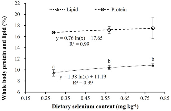 The elevation of dietary Se to 0.52 and 0.79 mg kg−1 significantly (p < 0.05) increased whole-body lipid (Table 6), following a logarithmic regression with Se contents in diet (y = 1.38ln(x) + 11.19, R2 = 0.99) (Figure 1). On the contrary, moisture content in fish fed these diets supplemented with OH-SeMet was significantly lower than those fed the control diet (0.29 mg kg−1) (Table 6). Despite whole-body protein contents not being significantly different among fish fed the different Se contents, protein contents tended to increase with the dietary Se content, following a highly correlated logarithmic regression (y = 0.76ln(x) + 17.65; R2 = 0. 99) (Table 6) (Figure 1). Whole-body ash content was not affected by dietary Se supplementation.