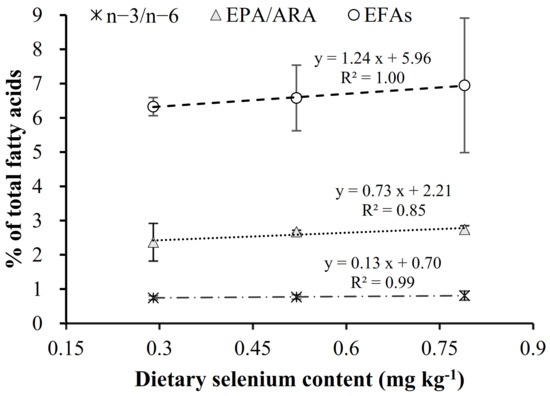 Liver fatty acid profiles followed a similar pattern to the whole-body lipid profiles and, thus, the increase in dietary Se was related to the content of the essential fatty acids (EFA: ARA + EPA + DHA) as well as in the n-3/n-6 and EPA/ARA ratios (Figure 2).