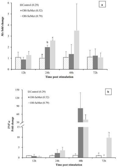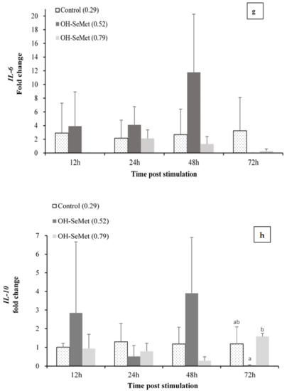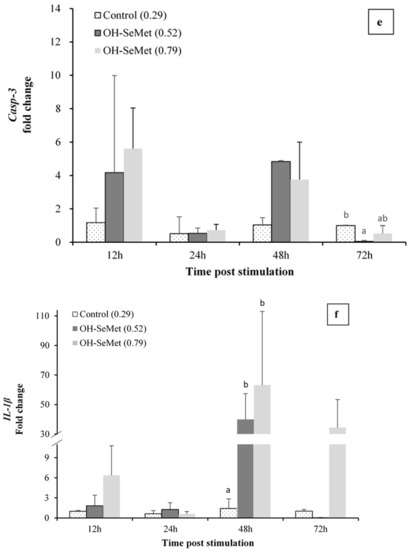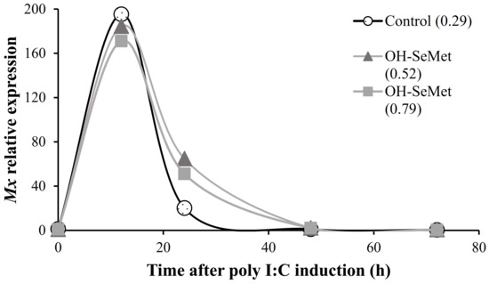 Selenium has been shown to affect both innate and acquired immunity, but its mechanisms of action and its relationship to the immune system are not entirely clear [66]. The innate and acquired immune system is composed of cellular and humoral components that are activated by disease, immunization, or administration of immunostimulants [67]. Selenium may have an immunostimulatory function, but its role is not yet well documented in fish [68,69,70,71]. Feeding pacu (Piaractus mesopotamicus) a Se-supplemented diet for 10 days enhances non-specific immune indicators, suggesting that antioxidant status may modulate the immune system [66]. Mx protein is a type I IFN-induced protein that helps inhibit viral RNA translation. As in other studies carried out in vivo for the stimulation of Mx using Poly I: C [67], the expression of this gene showed its highest values during the first days, later decreasing to baseline values. Specifically, in this study in seabream, the highest peak of expression was obtained at 12 h post-stimulation with Poly I: C, regardless of the diet used, recovering the basal expression levels at 48 h, in agreement with previous studies in this species [26]. On the contrary, in Atlantic salmon, the up-regulation of Mx gene by induction with Poly I: C remains for up to 9 days [67]. At 24 h post-stimulation, dietary OH-SeMet supplementation significantly raised the expression of the antiviral response gene Mx, further extending the protection against viral infections. To our knowledge, this is the first study in gilthead seabream that shows the effect of dietary Se levels on the expression of a Mx protein gene, one of the main components of the antiviral response in vertebrates [72]. The results are in agreement with the up-regulation of IFN-α by supplementation of SeMet up to 1 mg kg−1, precisely 24 h after the injection of poly I:C in rainbow trout [73], since Mx protein is a IFN-induced GTP-binding protein. Moreover, in trout SeMet supplementation also up-regulated other genes of anti-viral proteins 24 h after poly I:C injection [73] in agreement with the up-regulation of Mx in the present study. Both TNF-α and COX were also up-regulated by OH-SeMet supplementation, as it occurs in rainbow trout fed SeMet supplemented diets [73]. Other members of the TNF and TNF receptor superfamily and other inflammatory mediators were also up-regulated by SeMet supplementation in trout. Similarly, at 24 h, there was an up-regulation of the pro-inflammatory cytokine IL-1β, involved in immune genes regulation. On the contrary, the expressions of IL-6 and IL-10, associated with the anti-inflammatory response, were less affected by dietary Se levels. Overall, these results suggest that Se supplementation causes a stronger pro-inflammatory response after poly I:C induction as an antiviral response. Despite the fact that an extreme pro-inflammatory response could produce unrestrained tissue damage, the high expression levels were recovered at 72 h, particularly in fish fed intermediate Se levels. The expression of the signal transduction mediator Casp-3 was slightly up-regulated by OH-SeMet supplementation until 48 h post-poly I:C induction, in agreement with the slight enhancement of transcripts for this gene in rainbow trout fed SeMet diets [73]. The immune-regulatory role of Se may be related to its important antioxidant role or their presence in some selenoproteins, such as SeIP, which are important in immune response and, particularly, inflammation [74].