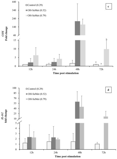 Nevertheless, such an immunostimulatory effect of dietary Se levels could be also indirectly mediated by the proportionally increased the EFAs (ARA, EPA and DHA) contents and the EPA/ARA ratio in liver. Moreover, these fatty acids increased in whole body of fish fed Se supplementation following a significant relation with Mx expression at 24 h (ARA: y = 0.0021x + 0.309, R2 = 0.96; EPA: y = 0.0247x + 1.4822, R2 = 0.95; DHA: y = 0.0577x + 2.375, R2 = 0.93). Both the type and level of dietary PUFA regulate the immune system [11] and the mechanisms involved in the modulation of the immune response by PUFA are well studied in mammals and, to a lesser extent, in fish [11,15]. Thus, changes in dietary PUFA alter fatty acid profiles of immune cells affecting membrane fluidity, intercellular interaction, receptors expression, or signal transductions. Additionally, these PUFAs produce certain eicosanoids and docosanoids that can either stimulate or inhibit immune cells in a dose-dependent manner. In fact, both classical (prostaglandins, PG; leukotrienes, LT; thromboxane, TXa) and non-classical (resolvins, maresins and protectins) eicosanoids and docosanoids [75] derived from ARA, EPA and DHA have important immunological functions [75]. These highly bioactive compounds act as pro-resolving mediators and recover homeostasis by resolving inflammatory response [76]. Particularly ARA and EPA are excellent substrates for COX enzymes, each leading to eicosanoids with different activity capacity. In gilthead seabream a recent study also demonstrates the importance to balance the dietary contents in ARA, EPA and DHA to better modulate the fish innate immune response to against potential immunological insults in gilthead seabream juveniles [77]. More specifically, DHA regulates the expression of IFN-induced genes expression in mammals [78] and could contribute for the up-regulation of Mx gene in the present study. Hence, the OH-MetSe-supplemented diets which led to a higher retention of EPA, DHA, and ARA in body tissues may help protect against viral infections through IFN-induced antiviral and resolve, helping to resolving inflammation.