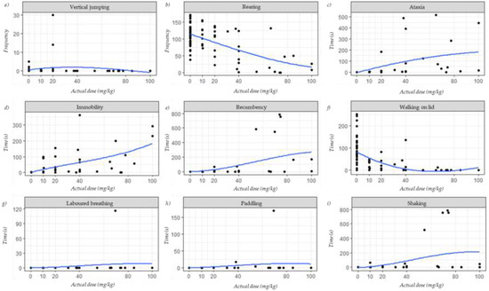 Behaviours reported for the first 800 s of the sedation period presented according to the actual doses of tiletamine-zolazepam in C57BL/6 mice: (a) vertical jumping; (b) rearing; (c) ataxia; (d) immobility; (e) recumbency; (f) walking on lid; (g) laboured breathing; (h) paddling; (i) shaking. Each point represents a single mouse. Blue trend lines are locally weighted smoothing (loess) lines.