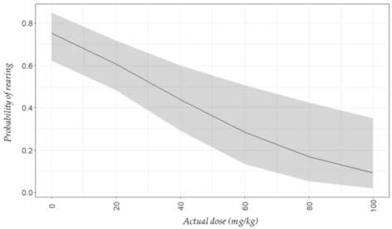 Predicted plot (±95% confidence interval) for probability of rearing (indicative of aversion) during euthanasia with CO2 according to the actual doses of tiletamine-zolazepam in C57BL/6 mice.