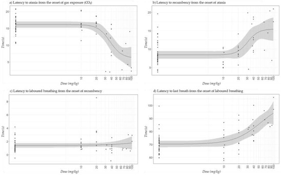 Predicted plots (±95% confidence interval) for the different behaviours observed during euthanasia with CO2 for the actual doses of the sedative tiletamine-zolazepam in C57BL/6 mice: (a) latency to ataxia from the onset of gas exposure (CO2); (b) latency to recumbency from the onset of ataxia; (c) latency to laboured breathing from the onset of recumbency; (d) latency to last breath from the onset of laboured breathing. Mice were observed until last breath (1.67 ± 0.31 min; mean ± SD). Each dot represents an individual mouse.