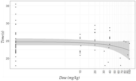 Predicted plot (±95% confidence interval) for the latency to recumbency from the onset gas exposure (CO2) during euthanasia with this gas considering the actual doses of the sedative tiletamine-zolazepam in C57BL/6 mice. Each dot represents an individual mouse.