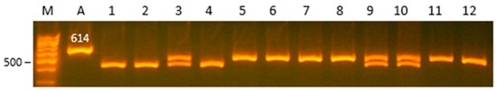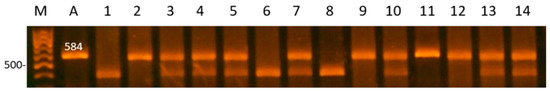 The TaqI polymorphism c.2851 G > T in gene SPEF2: 2, 9, 11, 12—genotype TT (584 bp); 3–5, 7, 10, 13, 14—genotype GT (584, 460, 124 bp); 1, 6, 8—genotype GG (460, 124 bp); A—amplicon; M—marker.