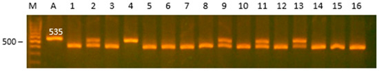 The HindIII polymorphism g.1536 C > T in gene TNP2: 1, 3, 5–8, 10, 12, 14–16—genotype TT (432, 103 bp); 2, 9, 11, 13—genotype CT (535, 432, 103 bp); 4—genotype CC (535 bp); A—amplicon; M—marker.