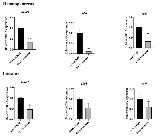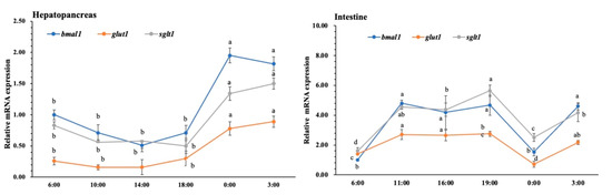 3.1. Daily Profile of BMAL1, GLUT1 and SGLT1 Expression in the Hepatopancreas and Intestine