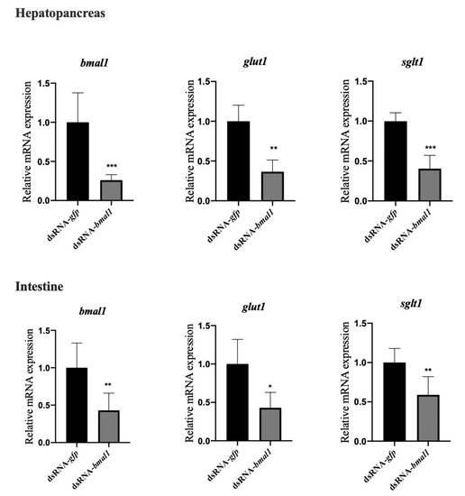 3.4. Knockdown of BMAL1 Decreased the mRNA Expression of Glucose Transporters (GLUT1, SGLT1) in the Hepatopancreas and Intestine of L. vannamei