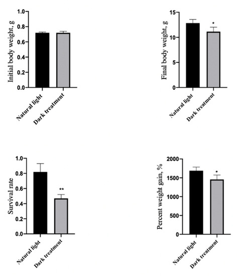 3.5. Effects of Dark Treatment on Growth Performance and Survival Rate in L. vannamei