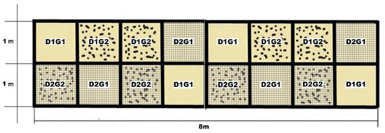Organization of boxes distributed based on the top cushion material which consists of sand (G1) or sand with geotextile (G2) over limestone (D1) or over a drainage package (D2) along with combinations of both treatments (D1G1, D1G2, D2G1, D2G2).