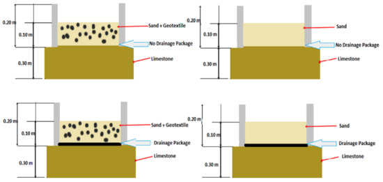 The design is a two-level experimental design with three factors (23) (Table 1) with two repetitions (sixteen). Details of the construction are shown in Figure 1. Factors are the addition of geotextile: where no geotextile is added (G1) and with 2 of geotextile chips added to the 10 cm deep surface (G2). The drainage package consists of a geotextile fabric laid over the limestone base, a geomesh layer and another geotextile fabric layer. The geotextile layers are used to avoid saturation of the geomesh with sand. The two conditions for the drainage layer are the absence of a drainage package (D1) and the incorporation of the drainage package (D2). Two gravimetric moisture contents (GMC %) were the lower at 11.16% ± 2.93 GMC (M1) or higher at 21.69% ± 3.90 GMC (M2).