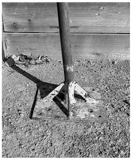 The rotational shear strength was recorded using a torsional shear tester [26]. The device used is based on a modification of ASTM F2333-04 where the cleats on the disk are replaced by a horseshoe. The device, shown in Figure 6, is used in equine research to address the weaker correlation between rider perception and grip [21,38]. To pre-set the disk into the surface, a 30 kg weight was dropped 0.30 m along a shaft onto a second plate with a size 3 steel-studded horseshoe mounted on the bottom of the plate. The horseshoe included two 2.5 cm long cleats, which were tapered from 1.35 to 0.50 cm diameter on its abaxial face. The rotational peak shear (RPS) load was measured with a digital torque wrench with a range of 4–200 NM, and a precision of 0.08Nm (Model ARM602-4, ACDelco, Taiwan, China). To record the failure strength, the torque wrench is turned until it reaches the maximum load while keeping the plate flat on the ground. Five measurements were made for each box. In order to minimize operator variability, the same person performed all of the testing, which is consistent with best practice [48].
