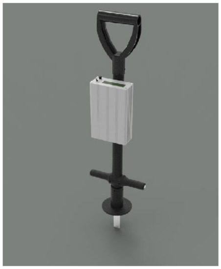 The device has recently been proposed as an international standard measurement tool [45]. In addition to the two distinct measures of penetration and shear, the device also calculates an integrated measure of the two measured values, which is referred to as “the going index”. The going index is commonly used in Thoroughbred racing to describe the surface conditions [46]. The peak force required to press the probe into the surface and the peak torque applied to the handle to rotate the probe to 45 degrees are logged to memory in the device and are then used to calculate the going index. The torque is calculated from the strain gauges located 128 mm from the tip and the calculation of load assumes that the rotation of the device occurs around top of the plate of the probe, which penetrates into the surface [46,47].