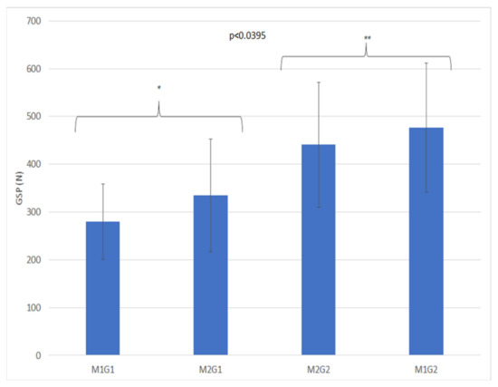 Mean of double interaction moisture x geotextile for GSP (in N) M 1: GMC was 11.16% ± 2.93 and treatment; M2: 21.60% ± 10.90; G1: without geotextile; G2: with 2 kg/m2 of geotextile. The stars (*, **) indicate significative statistically differences.
