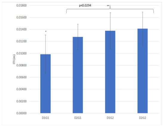 Double interaction of the drainage and geotextile for ITD (m). D1: no drainage; D2: drainage package; G1: without geotextile; G2: with 2 kg/m2 of geotextile. The stars (*, **) indicate significative statistically differences.