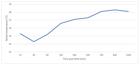 Piglet rectal temperature change from 15 min to 24 h post-partum. Modified from Anderson et al. [42].