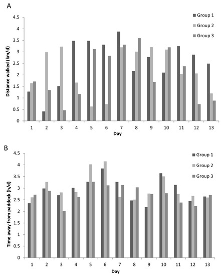 The average daily milk yield over the study period was greater in Groups 1 and 2 (mean ± SE; 22.6 ± 0.18 and 22.9 ± 0.18 kg/d, respectively) compared with Group 3 (21.6 ± 0.18 kg/d; t1,30 > 4.0; p < 0.01). The change in the milk yield was not associated with daily walking distance for any of the groups (F1,6 < 1.5, p > 0.27). The change in the milk yield for Group 3 was negatively associated with time off-paddock (estimate: −1.3 ± 0.009 kg/d/h off-paddock; F1,6 = 6.7, p = 0.04), but this was not the case for the other two groups (F1,6 < 1.5, p > 0.27).