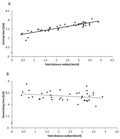 Regression analysis of the total distance walked against behaviours in the paddock. (A) Grazing time increased with the distance walked, and (B) ruminating time decreased with the distance walked. The predicted values from the regression models are plotted for each of the 13 days for the 3 groups.