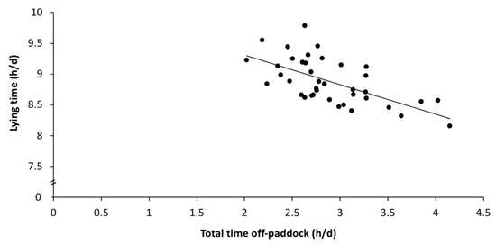 Large individual variabilities in the daily behaviour patterns were observed; for instance, some cows spent only 4 h grazing (while others spent up to 10 h grazing), and some cows were lying down for about 7 h (while others were lying down for over 11 h). Some of this individual variation could be explained by walking distance and time off-paddock. On days that cows walked greater distances, grazing time increased by about 14 min (Figure 2A; estimate: 13.9 ± 4.8 min/km walked; F1,32 = 8.3; p = 0.007), and ruminating time decreased by about 7 min for each additional km walked (Figure 2B; estimate: −6.8 ± 3.3 min/km; F1,32 = 4.1; p = 0.05), but there was no association with lying time (F1,32 = 0.68, p = 0.42). On days that cows spent more time off-paddock, lying time decreased by about 30 min for each additional hour spent off-paddock (Figure 3; estimate: −34.2 ± 14.2 min/h off-paddock; F1,32 = 5.9; p = 0.02), but there was no association with the grazing or ruminating times (F1,32 < 2.0, p > 0.16).