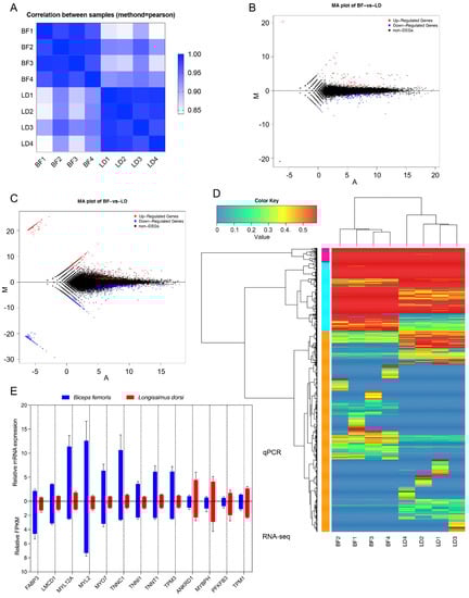 Short-read sequencing quantifies the expression of genes and transcripts of goat muscles. (A) Correlations between eight samples used for short-read sequencing. The correlation between each pair of samples in the sequencing libraries was calculated from the FPKM value. Samples with a Pearson’s correlation value ≥ 0.92 were considered as the same experimental replicates. The deeper blue color represents closer correlation between samples. (B) MA plot indicating differentially expressed genes between the BF and LD muscles. The red and blue dots represent the upregulated and downregulated genes in BF compared to LD muscles, respectively. |log2(FoldChange)| > 1 and padj < 0.05 is considered up- or downregulated. (C) MA plot indicating the differentially expressed isoforms between the BF and LD muscles. (D) Cluster enrichment of differentially expressed transcripts from LD and BF samples. The gradient color key represents the adjusted p-value, which is more significantly different when having more red color. (E) RNA-seq results are consistent with qPCR data. qPCR was used to verify the expression profiles of 13 randomly selected differentially expressed genes in RNA-seq results. The gene expression levels obtained from qPCR were normalized to GAPDH and are shown as mean ± standard error of mean (SEM) (n = 4). Data from RNA-seq is shown as mean FPKM ± SEM (n = 4).