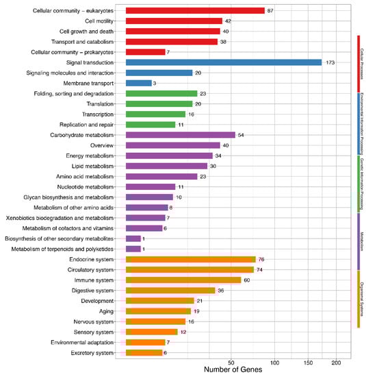 The novel isoforms (7420) were aligning against the NR, GO, KOG, KEGG, and Swiss-Prot databases for functional annotation. Results showed that 72.79%, 29.84%, 49.68%, 4.15%, and 25.22% of the novel isoforms were mapped to the NR, GO, KO, KOG, and Swiss-Prot databases, respectively; however, 26.91% of the novel isoforms were not annotated in any of the databases. KOG, GO, and KEGG annotations of the novel isoforms are shown in Figures S1–S3, respectively. Novel isoforms from novel and known genes were mapped to the NR, KO, KOG, and Swiss-Prot databases, followed by prediction of coding capacity. After filtering, 2745 long non-coding RNAs (lncRNAs) with low coding capacity and/or were more than 200 bp in length, were identified (Table S7), highlighting the advantage of SMRT sequencing in identifying lncRNAs.
