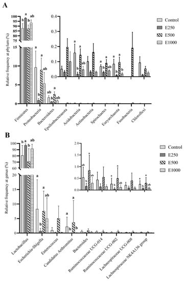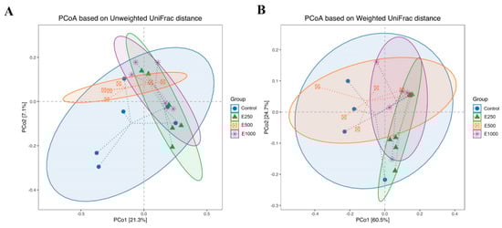 The similarity between bacterial communities present in each group is represented by principal coordinate analysis (PCoA) in Figure 1. In the PCoA plot based on the unweighted UniFrac distance, the E250 significantly changed the ileal microbial structure (PERMANOVA; r = 0.18, p = 0.049), whereas the E500 and E1000 did not significantly affect it (p > 0.07) as compared to the control (Figure 1, Table S2). The ileal microbiota structure of the E500 group had significantly diverged from that of the E250 and E1000 (PERMANOVA; r = 0.17, p = 0.012 and r = 0.15, p = 0.043, respectively). However, the PCoA plot based on weighted UniFrac showed that a significant difference was observed in the ileal microbiota structure between E250 and E500 treatments (PERMANOVA; r = 0.28, p = 0.033), and there was no significant difference between the control and E250, control and E1000, and E500 and E1000 groups (Table S2).