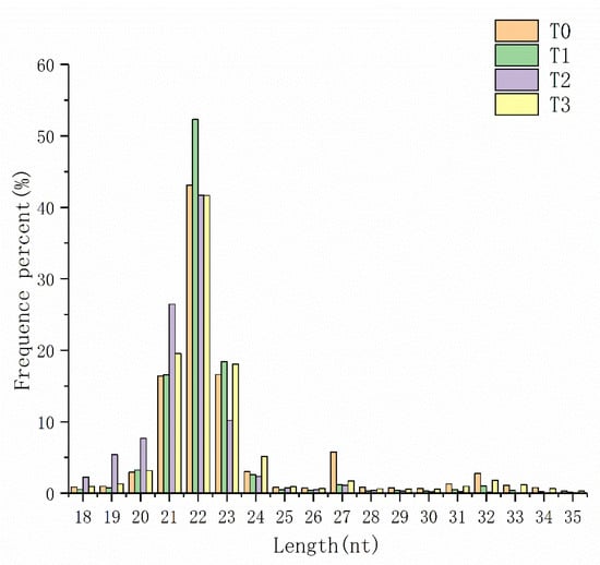Distribution statistics of small RNA fragment length in four samples. X-axis represents the length distribution of small RNA in T0, T1, T2 and T3 group. The Y axis represents the percentage of each length of small RNA. MiRNAs of 22 nt in length were the most common type.