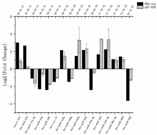 Differently expressed miRNAs validated by qRT-PCR. Comparison was carried out between sRNA-Seq results and qRT-PCR validation results. The 16 selected miRNAs showed concordant expression patterns when the 2 different methods were used.