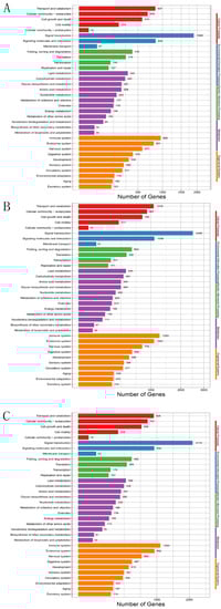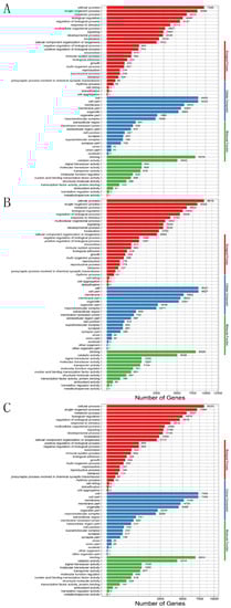 GO function classification of the differentially expressed genes comparison between the groups. (A) T0 vs. T1, (B) T0 vs. T2, (C) T0 vs. T3. The x-axis represents the number of genes and the y-axis represents different Gene Ontology (GO) term functional classification.
