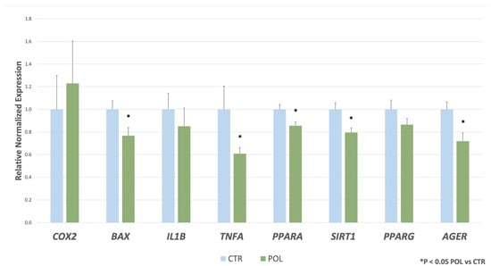 The expression levels of SIRT1, TNFA, AGER, BAX, and PPARA were lower (p < 0.05) in POL group compared to CTR one (Figure 1). No differences between CTR and POL groups were evidenced for COX2, IL1B, and PPARG gene expression (Figure 1).