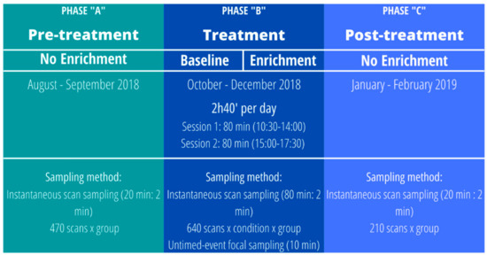 We followed an ABC design (Figure 1), comparing the effects of the treatment phase (B) with a pre-test (A) and a post-test phase (C) (Models 2–9, see below). The treatment phase was structured in two alternated conditions: baseline (control days with no enrichment activity) and enrichment (days where treatment was incorporated). Eight baseline and eight enrichment days were randomly distributed for each group in a two-month period (from 22 October to 21 December 2018), excluding weekends (as visitors are more numerous than on weekdays). That is, the enrichment was available, on average, 1–2 times per week. Moreover, to avoid order effects, we also compared the effects of participation in the enrichment during the treatment phase (including baseline and enrichment days; Models 2b–9b, see below).