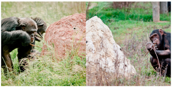 - Nash, V.J. Tool use by captive chimpanzees at an artificial termite mound. Zoo Biol. 1982, 1, 211–221. [Google Scholar] [CrossRef]