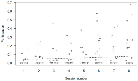 Participation and changes in behaviors within the treatment phase (Models 2b–9b). In Model 2b (tool use), the full null model comparison was significant, with participation in the enrichment activities predicting a higher proportion of tool use, which increased across sessions (Figure 5). In Model 3b (feeding), the full null model comparison was significant, revealing that participation in the enrichment predicted a higher proportion of feeding, with no significant changes across sessions (Figure 6). In Model 4b (inactivity), the full null model comparison was significant, showing a link between higher participation and lower inactivity, which did not change across sessions (Figure 7). In Model 5b (abnormal behaviors), the full null model comparison was not significant. In Model 6b (self-directed behaviors (rubs and scratches)), the full model differed significantly from the null model, with the rate of self-directed behaviors decreasing across sessions but no significant effect of participation. In Model 7b (social proximity), the full null model comparison was significant, with higher participation predicting a higher proportion of proximity which did not change across sessions (Figure 8). Finally, the full null model comparison was not significant for either Model 8b (affiliation-related behaviors) or Model 9b (aggression-related behaviors).